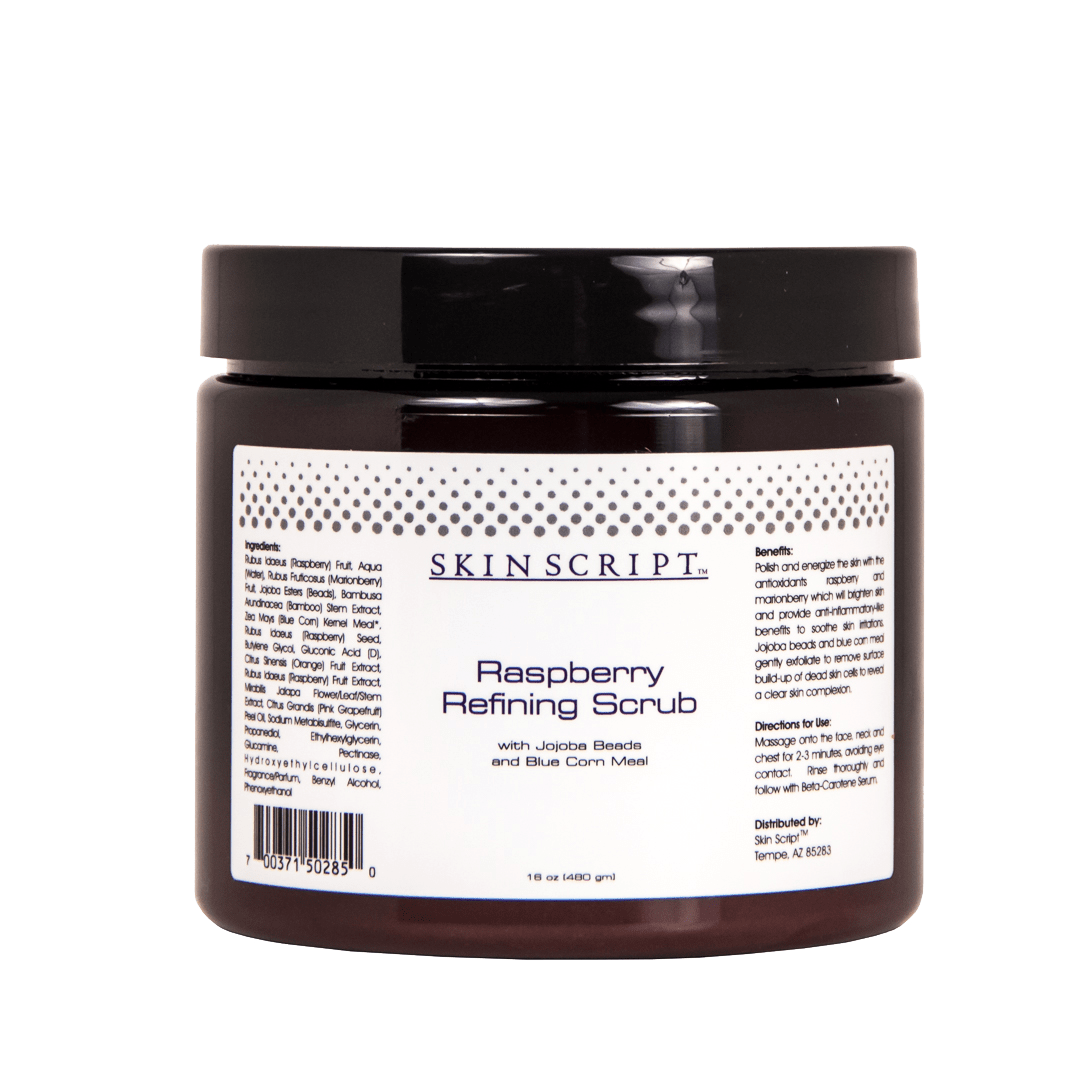 The Raspberry Refining Scrub polishes and energizes the skin with the antioxidants raspberry and marionberry which will brighten skin and provide anti-inflammatory-like benefits to soothe skin irritations. Jojoba beads and blue corn meal gently exfoliate removing the build-up of dead skin cells to reveal a clear skin complexion. This all-natural scrub is safe for pregnant, lactating, sensitive and teen clients as it contains no acids.